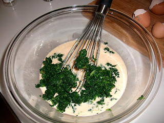 Next, start adding the cool ingredients. Mix after each addition, just to make sure it gets evenly distributed. So in goes the very squeeze-dried spinach.